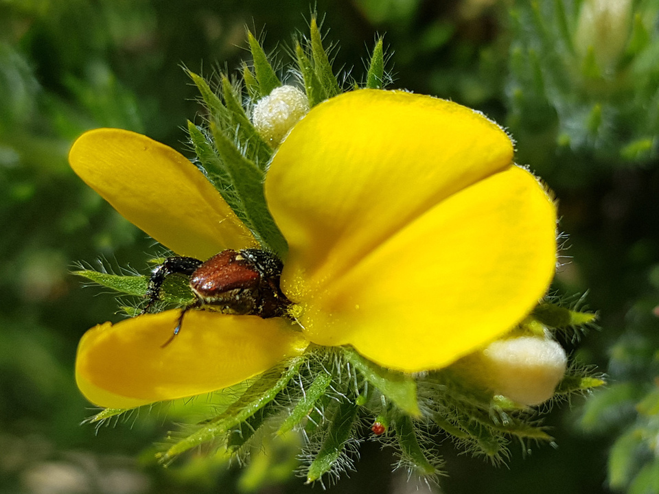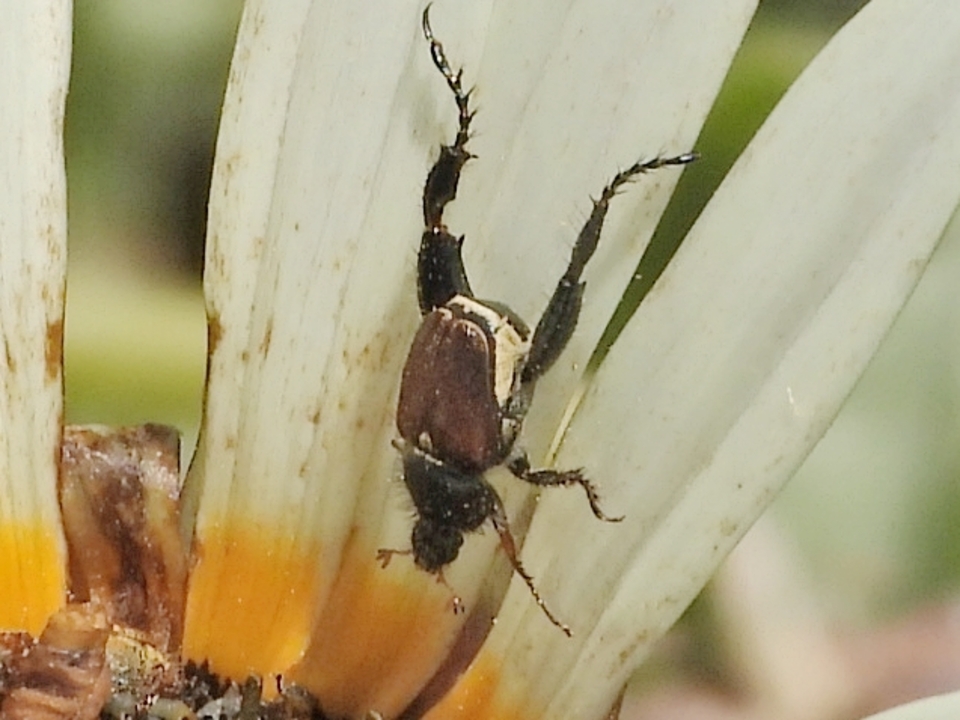 Monkey beetles are scarab beetles, a group of around 70 genera and 850 described species within the tribe Hopliini. The placement of this tribe within the family Scarabaeidae is uncertain between Melolonthinae and Rutelinae. Many species visit flowers for pollen and nectar, or browse on the petals. The beetles are important pollinators of Aizoaceae and Asteraceae in grazed and ungrazed areas, as well as many others.
