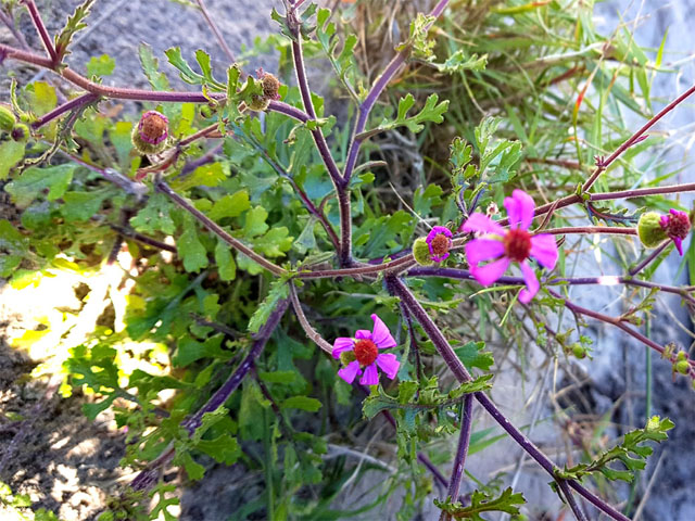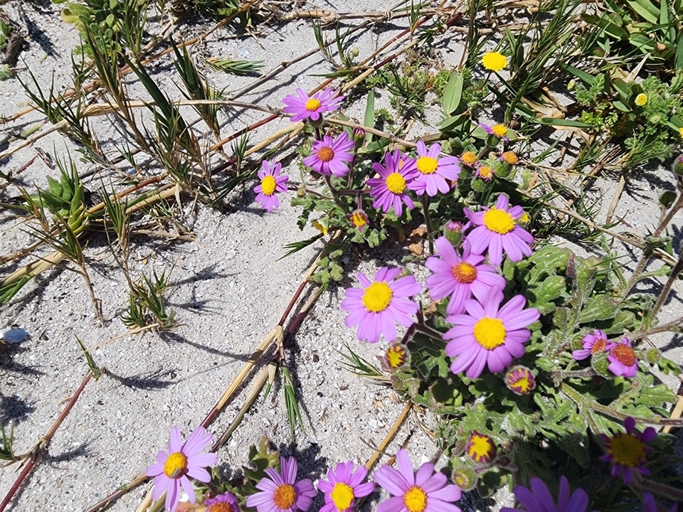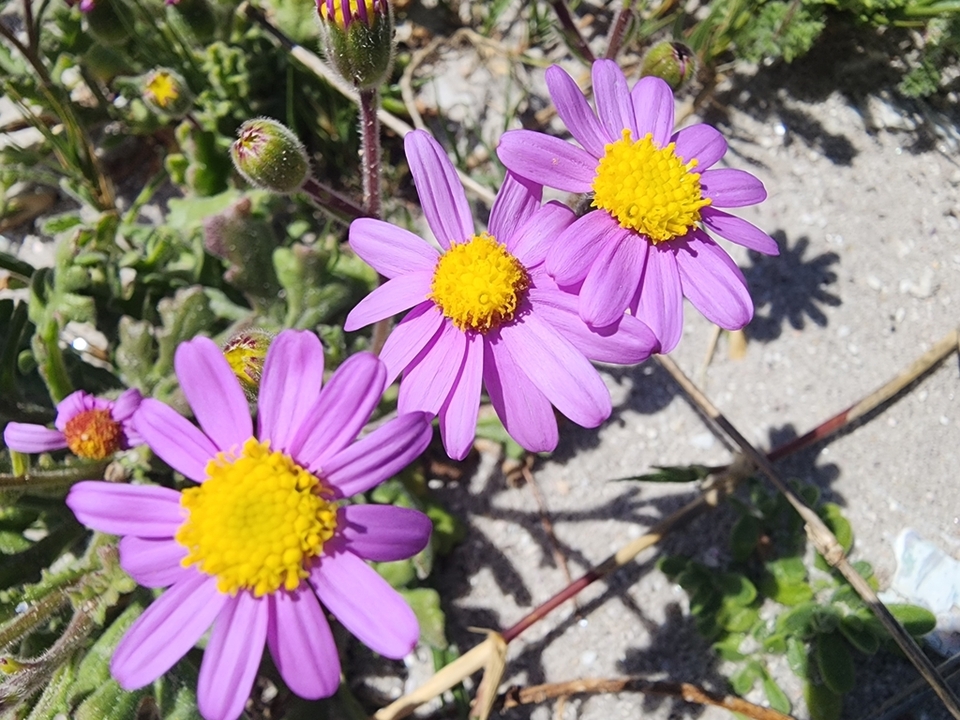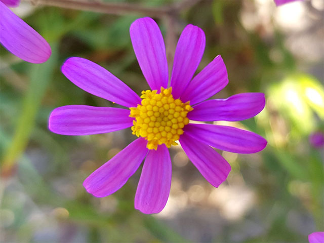 The flower heads measure 2, 5 –30 mm in diameter, resemble branched clusters or corymbs and consist of magenta ray and yellow disc florets. The cylindrical involucral bracts are free, in a single row with one to three minute bracts at the base.