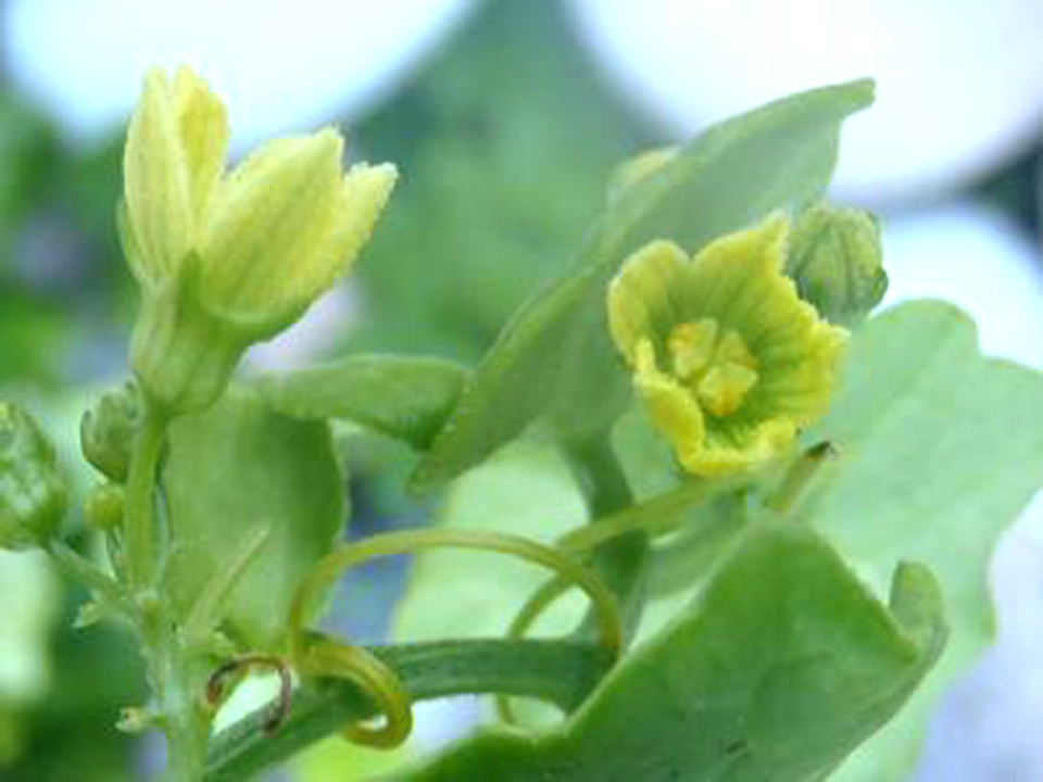 Woody stemmed, tuberous climber with curling tendrils, up to 2m; angled stems. Leaves heart-shaped, shiny-green with prominent veins; small flowers are pale yellow, cup-shaped, male flowers in a cluster and female flowers singular on the stem; bright orange fruit. Tubers eaten by porcupines.