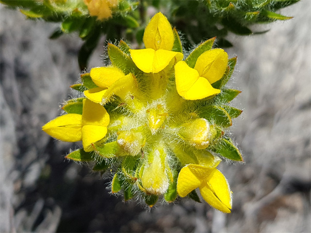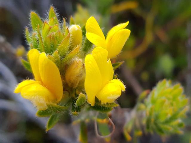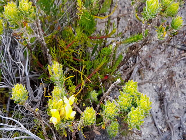 Erect shrublet up to 40cm. Leaves 3-foliolate, leaflets linear-lanceolate,10-20mm long, flat, glabrous or thinly hairy; flowers bright yellow in terminal heads, often partly reddish on the standard, hairy keel and silky calyx with tapering, awl-shaped lobes. Lowland fynbos, up to 400m