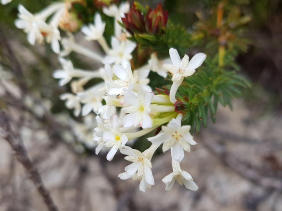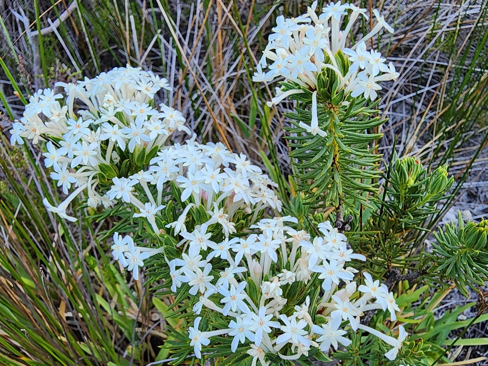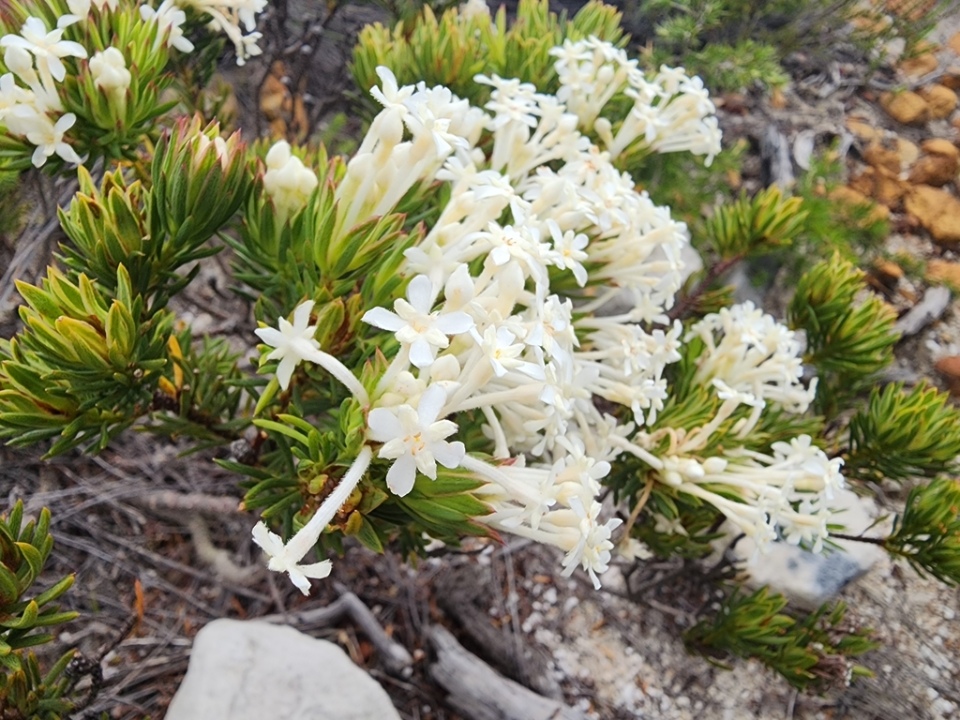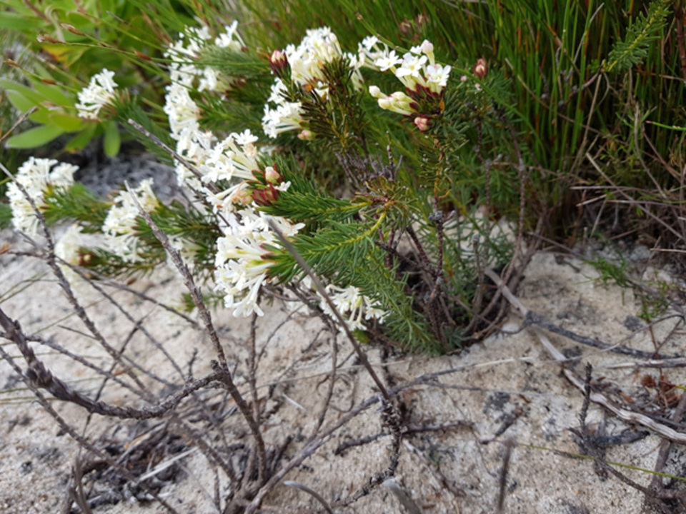 Gnidia pinifolia (Pine-leaved Saffron Bush) is a hardy, erect South African fynbos shrub, growing up to 1m tall with needle-like leaves and fragrant, white-to-pink flowers present year-round, peaking in summer. It thrives in full sun, well-drained soil, and is ideal for gardens, preferring coastal, sandy areas.