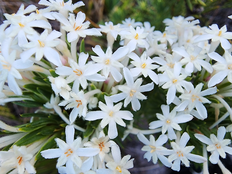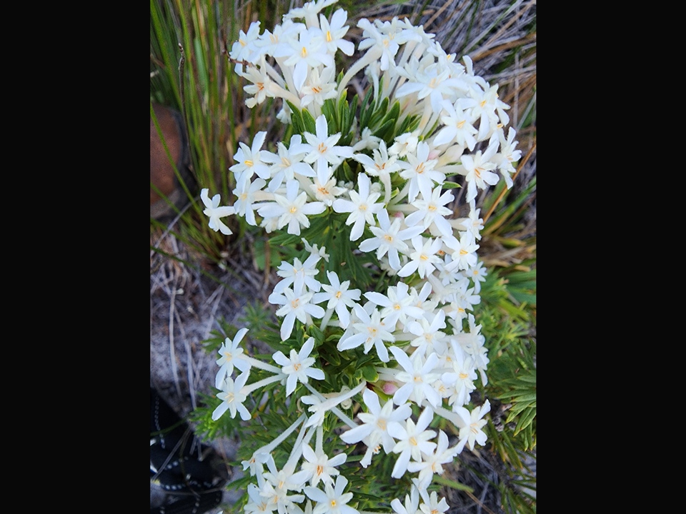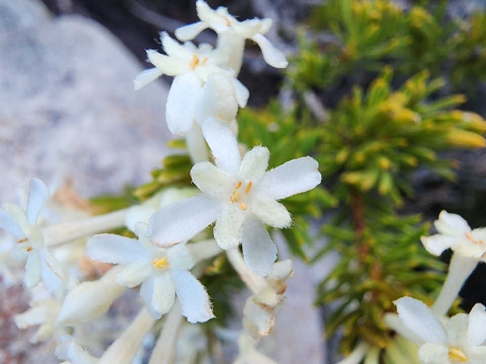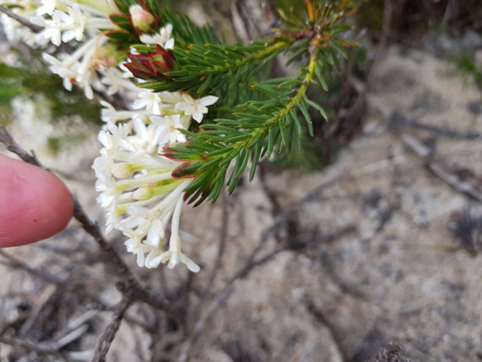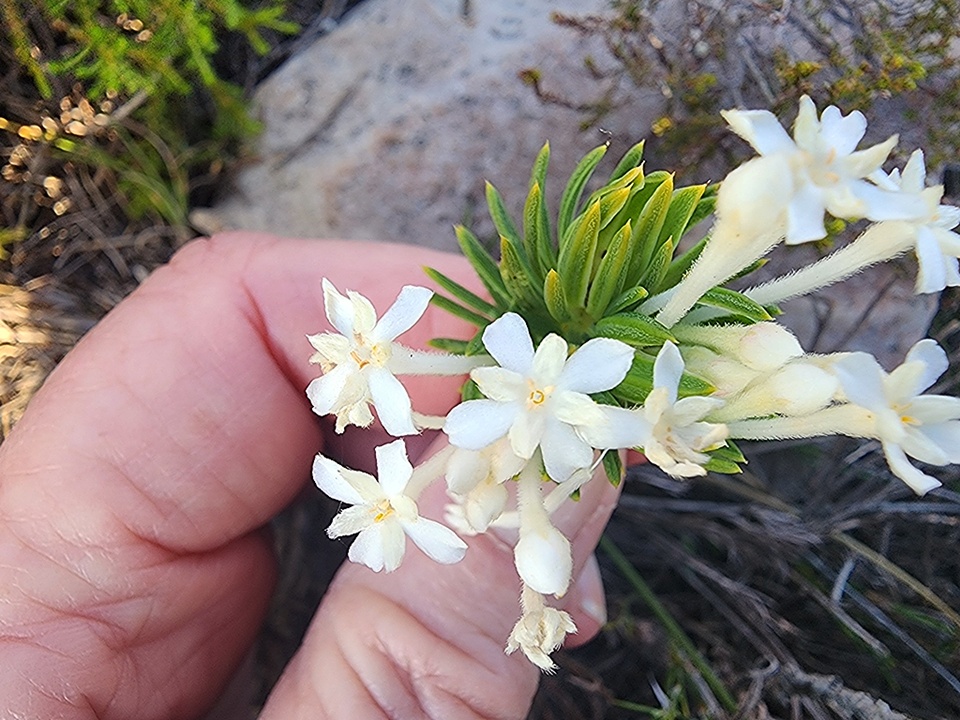 Gnidia pinifolia (Pine-leaved Saffron Bush) is a hardy, erect South African fynbos shrub, growing up to 1m tall with needle-like leaves and fragrant, white-to-pink flowers present year-round, peaking in summer. It thrives in full sun, well-drained soil, and is ideal for gardens, preferring coastal, sandy areas.