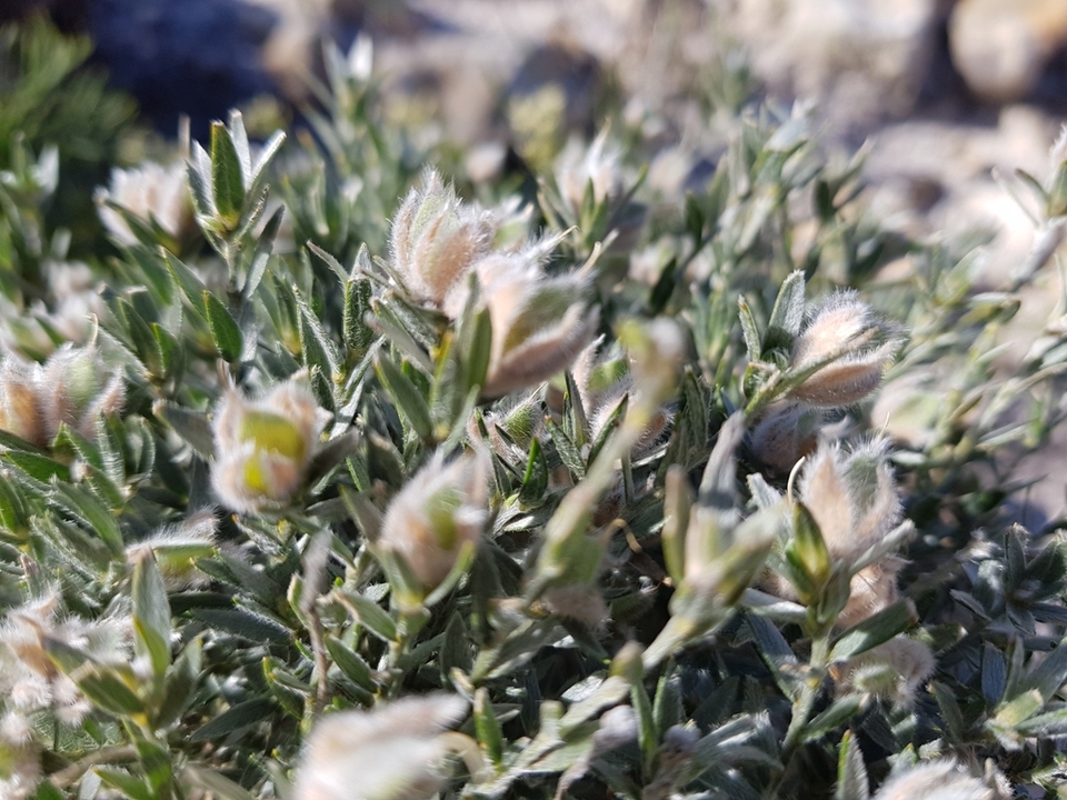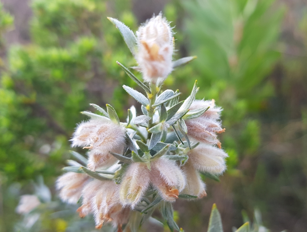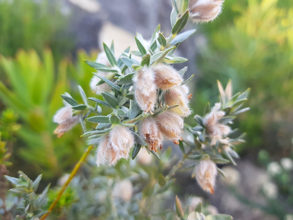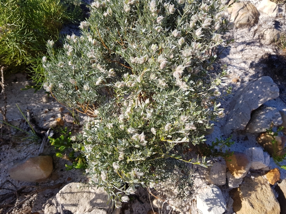 Amphithalea tomentosa (hairy amphithalea) is a low-growing, silvery-grey shrub native to South Africa's Cape Floristic Region, characterized by lemon-yellow to greenish-yellow flowers clustered at branchlet tips. Belonging to the Fabaceae family, it has hairy leaves, inflated pods, and thrives in low-lying, subtropical fynbos habitats.