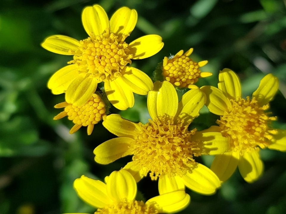 Flowers: Bright yellow, radiate, daisy-like flowers arranged in terminal, lax, flat-topped clusters (corymbs).