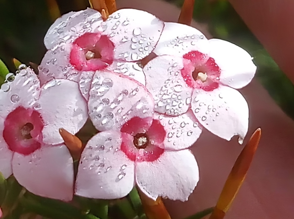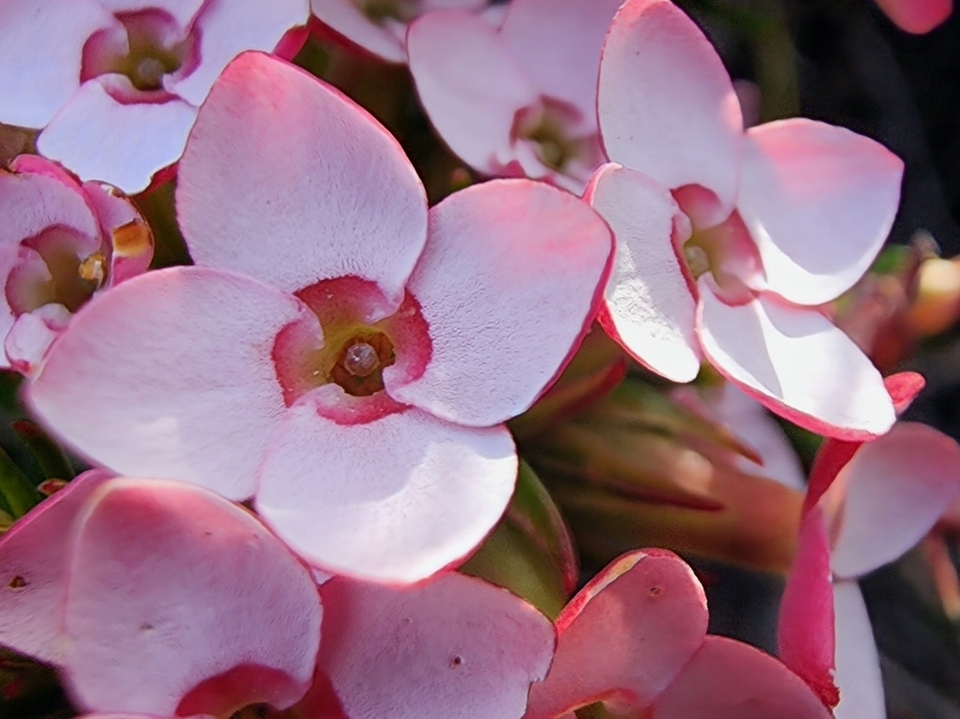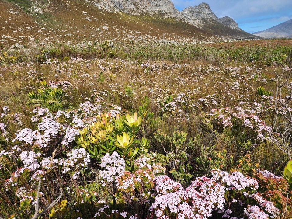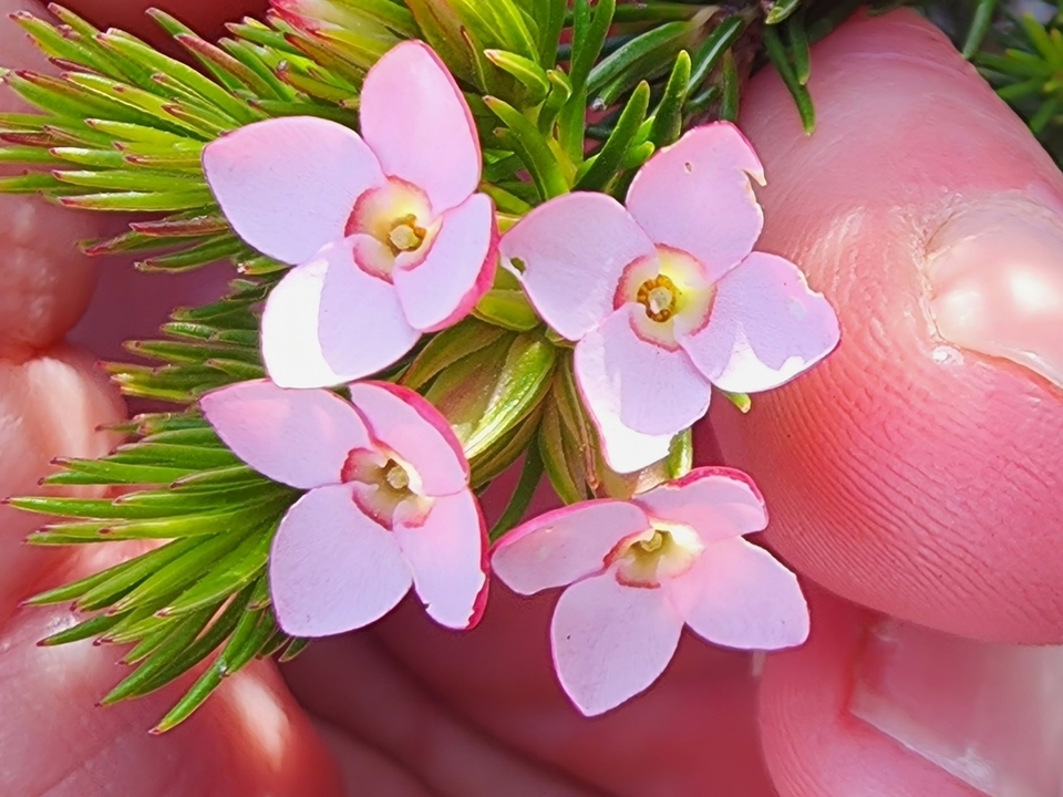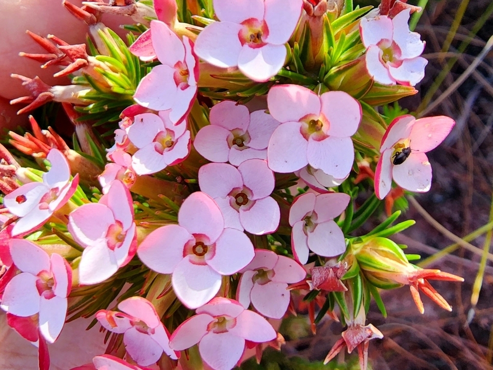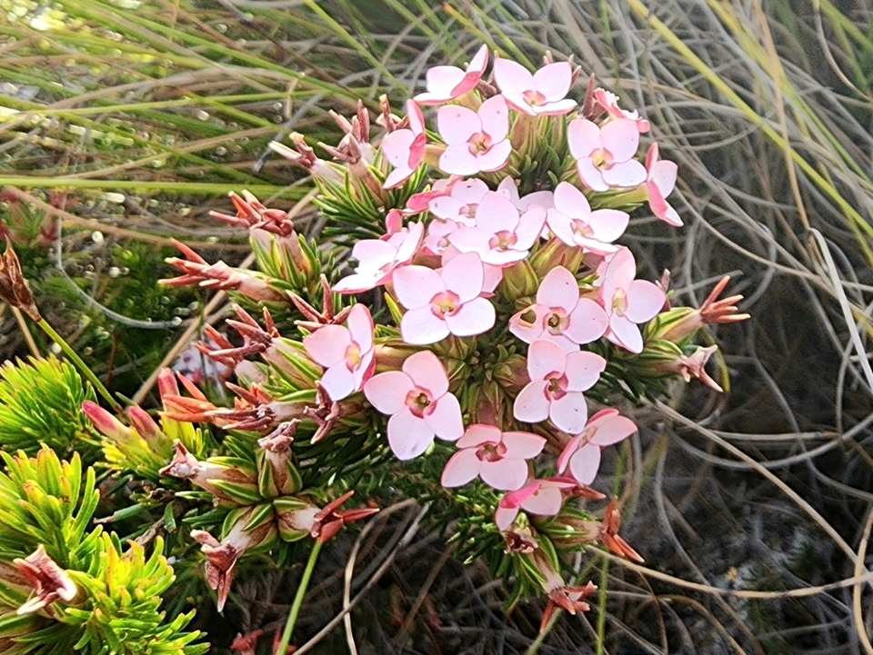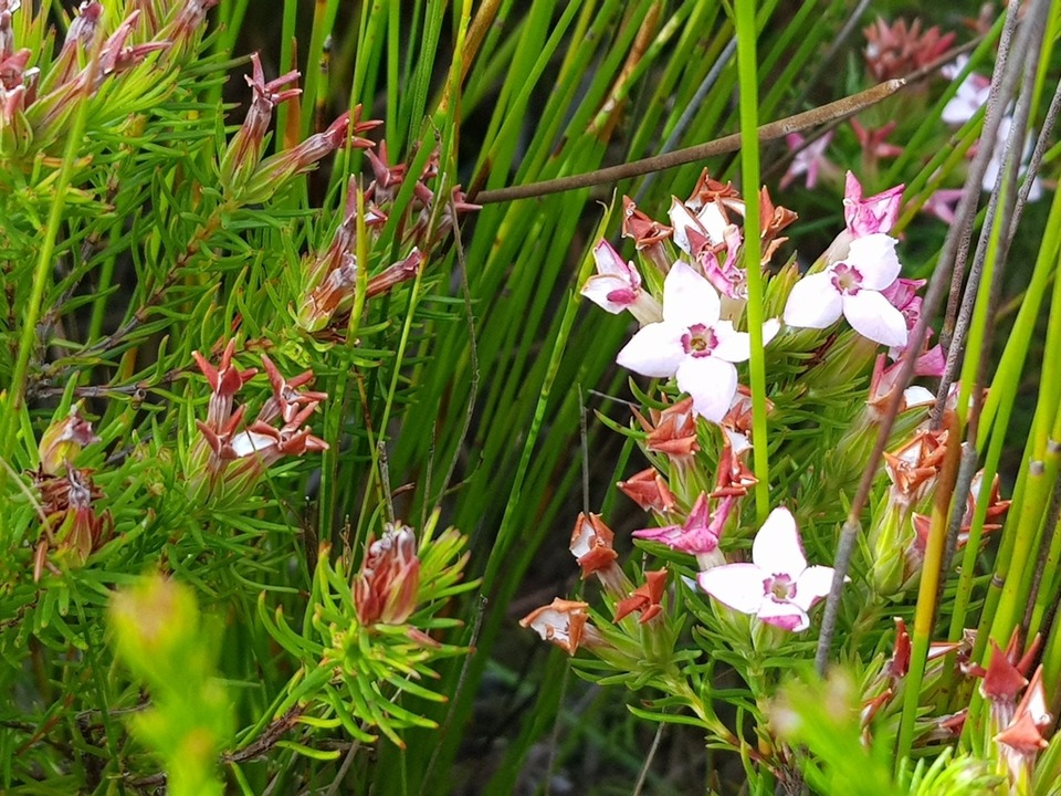 Four-sister heath must be the easiest Erica to identify. It has a very distinctive grouping of four flowers at the end of each flowering branch. Each flower has a pink “mouth”. How pretty is that! We have observed E. Fastigiata in seepage areas close to the sea, where they form dense and widespread populations. We have also seen magnificent stands in the mountains around Rooiels.