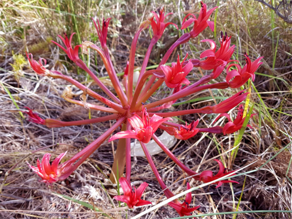 2021-06-10 | Brunsvigia orientalis | Candelabra lily, chandelier lily, sore-eye flower (Eng.), ajuinbol, koningskandelaar, kandelaarblom, Maartblom, perdespookbossie, rolbossie, seeroogblom (Afr.) | Amaryllidaceae | 7703RG | Red | Autumn | K, N, S, V, | View | |