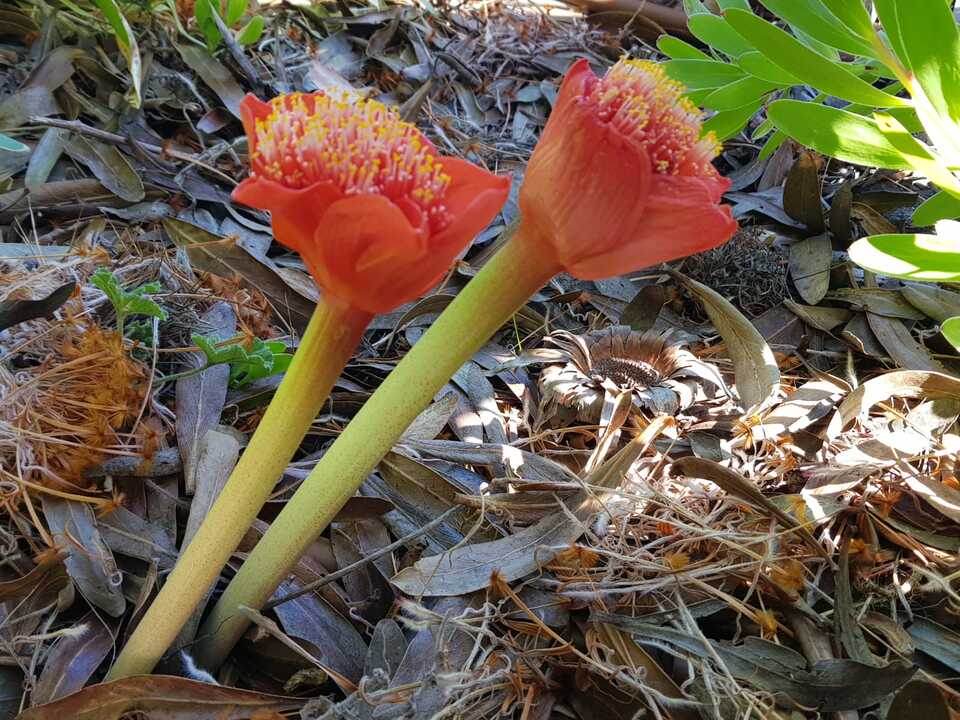 2021-06-10 | Haemanthus coccineus | Spotted Bloodlily, March flower, April fool, blood flower, paintbrush lily, powderpuff lily, (Eng.); bloedblom, rooikwas, bobbejaansool, Maartblom, misryblom, velskoenblaar (Afr.) | Amaryllidaceae | 7702RG | Orange | Autumn | E, K, N, S, V, G | View | |